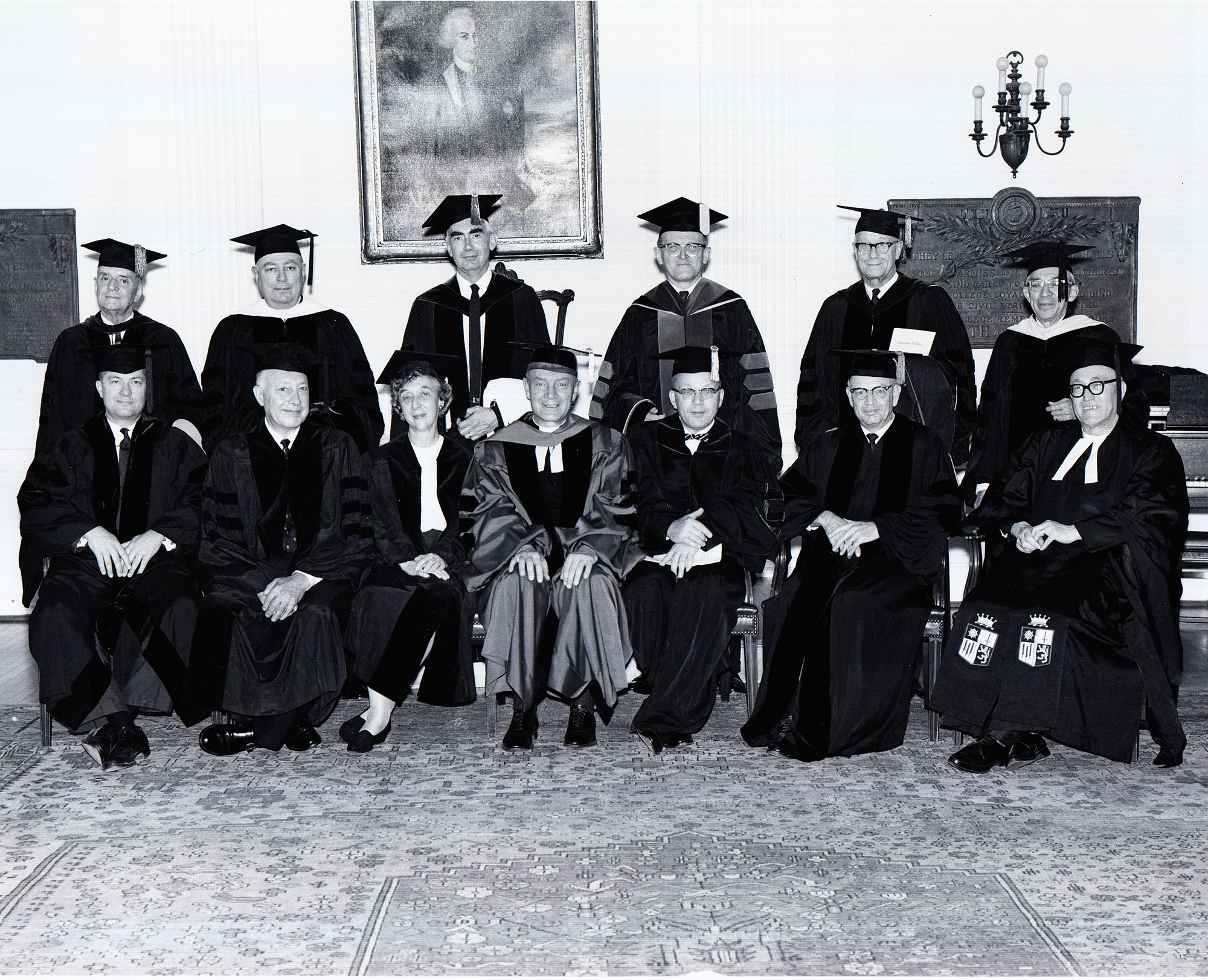 A group shot inside of Old West of the honorary degree recipients and their sponsors at Commencement on June 7, 1964.