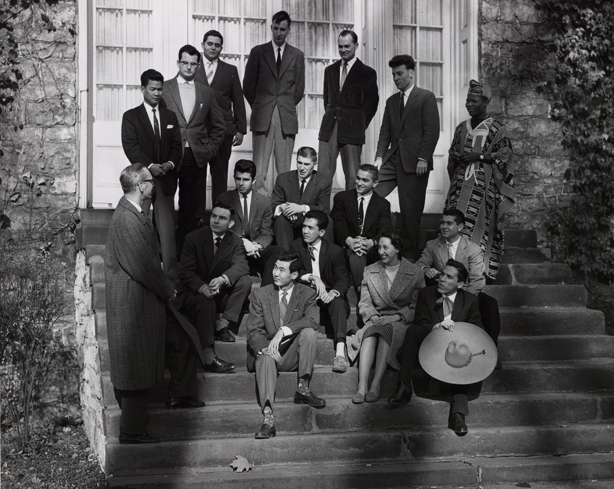 A group of international students on the steps of Old West with Professor Milton E. Flower ('31) in 1958.