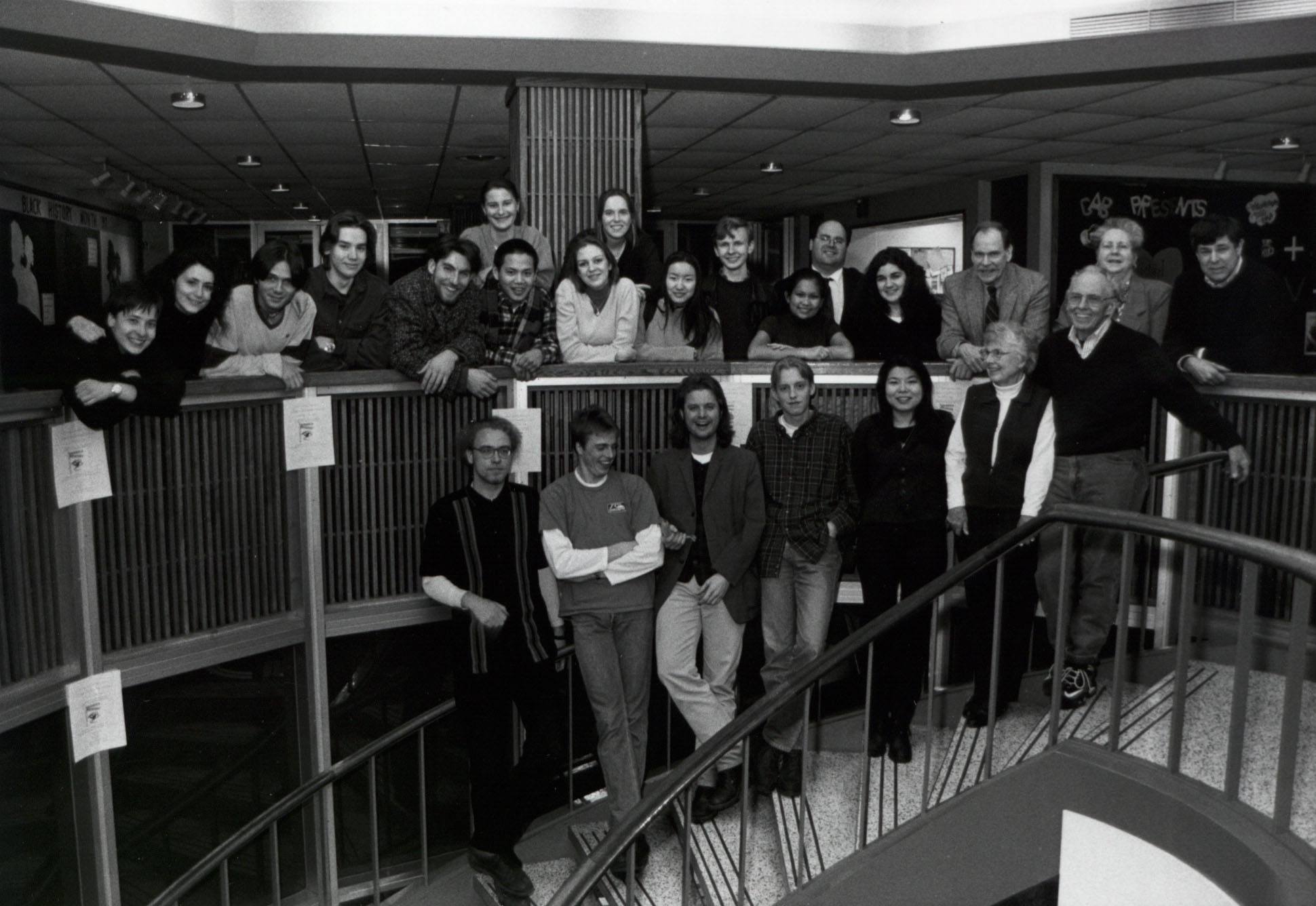 View of a group of international students by the stairwell in the Holland Union Building during the 1996-1997 academic year.