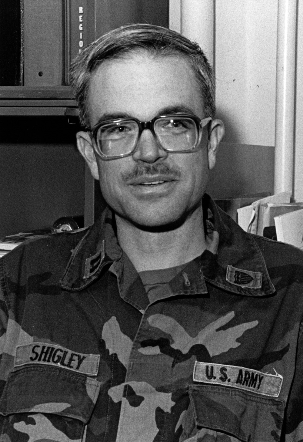 James Shigley, professor of Military Science, around 1985. Location Photograph Archives Format Photographic Print, B&W Decade 1980-1989 Roles Faculty People Shigley, James F.