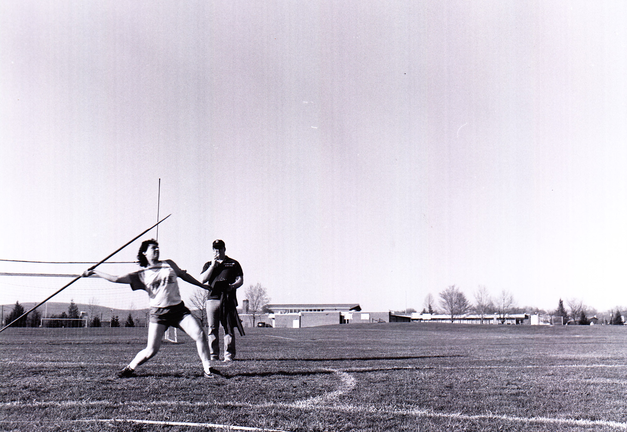 View as a student throws the javelin as a coach looks on in 1989. Location Photograph Archives Format Photographic Print, B&W Decade 1980-1989 Athletics Track and Field (Women's) Roles Coaches Students