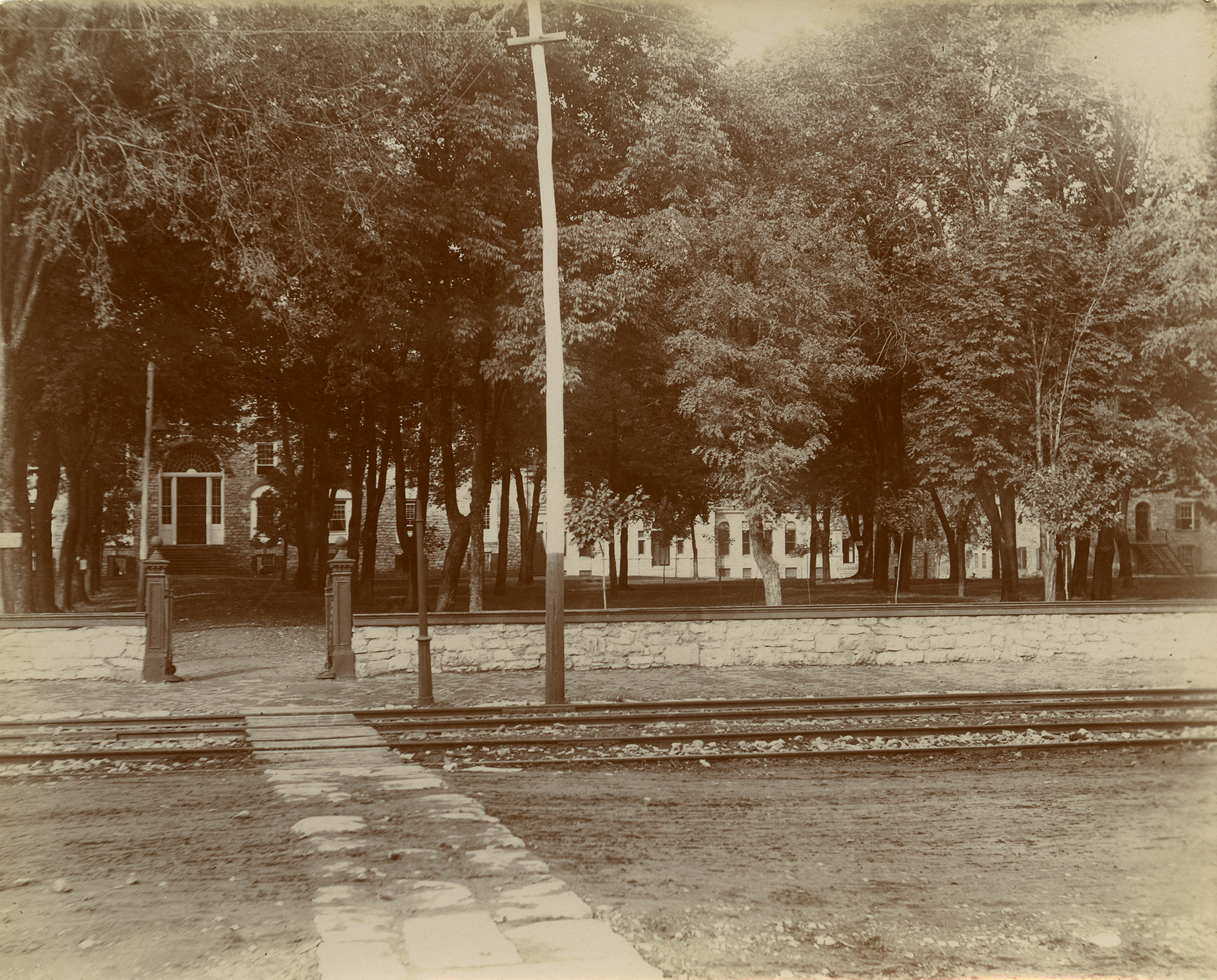 View of the John Dickinson Campus from W. High Street around 1895. The doors to Old West are visible through the trees.