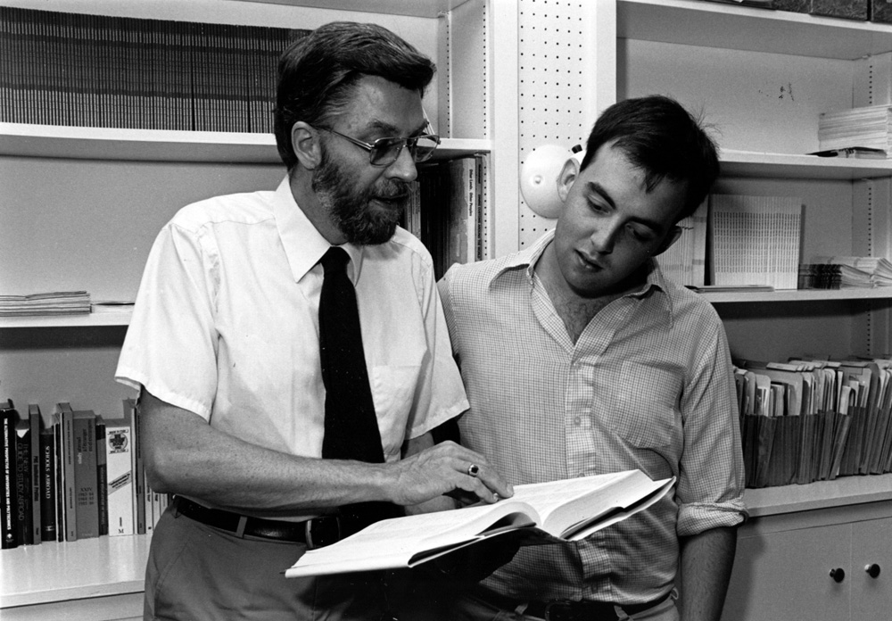 French professor John Henderson with student Brian John Fish '86 in July 1984. Location Photograph Archives Format Photographic Print, B&W Decade 1980-1989 Roles Faculty Students People Henderson, John Stanton Fish, Brian John Other Student-Faculty Interaction