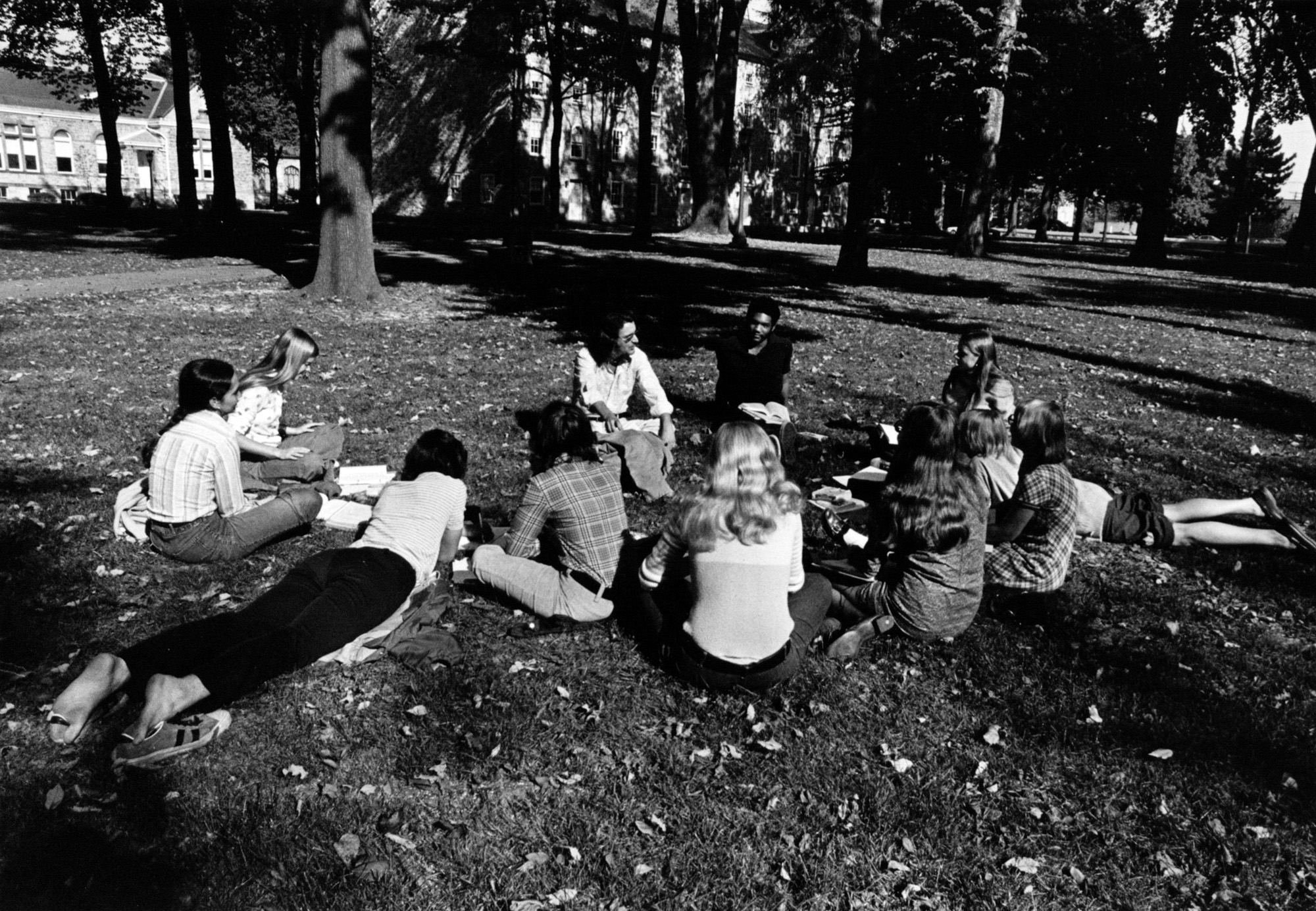 Professor John Draper of the Spanish department hosts class on the grass of the academic quad, fall 1971.