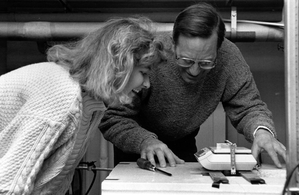 Physics professor John Luetzelschwab smiles over a project with Stephanie Ellis, Class of 1992, on March 20, 1991.