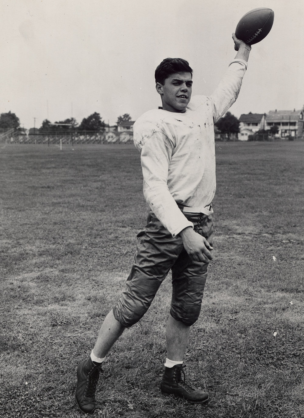 View as Joseph S. Ammerman (Class of 1948) holds a football. Location Photograph Archives Format Photographic Print, B&W Decade 1940-1949 Athletics Football Roles Students People Ammerman, Joseph Scofield
