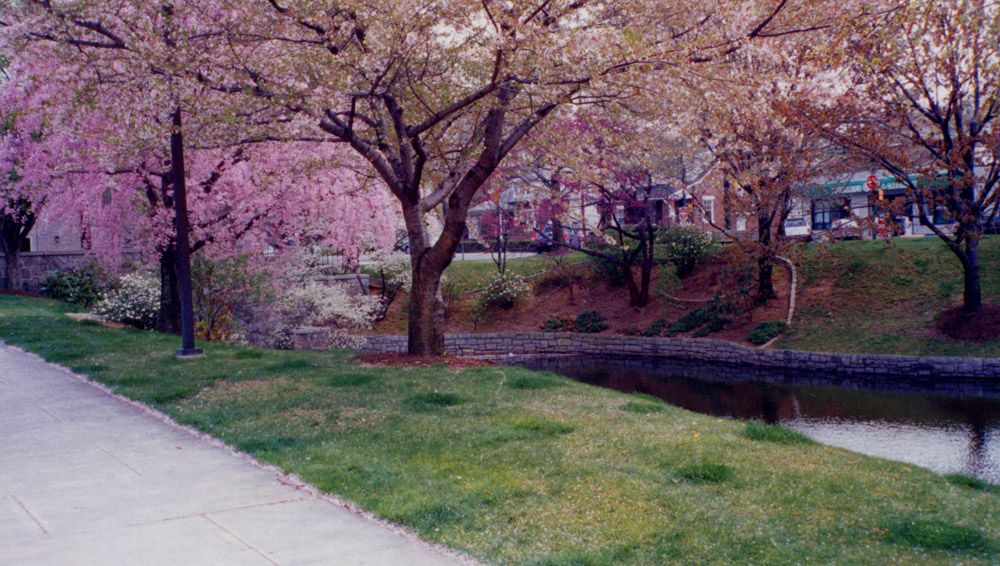 View of the pond facing towards the Cherry Street-High Street Intersection. Location Photograph Archives Format Photographic Print, Color Decade 2000-2009 Places Kline Center Other Campus Spring Scenes