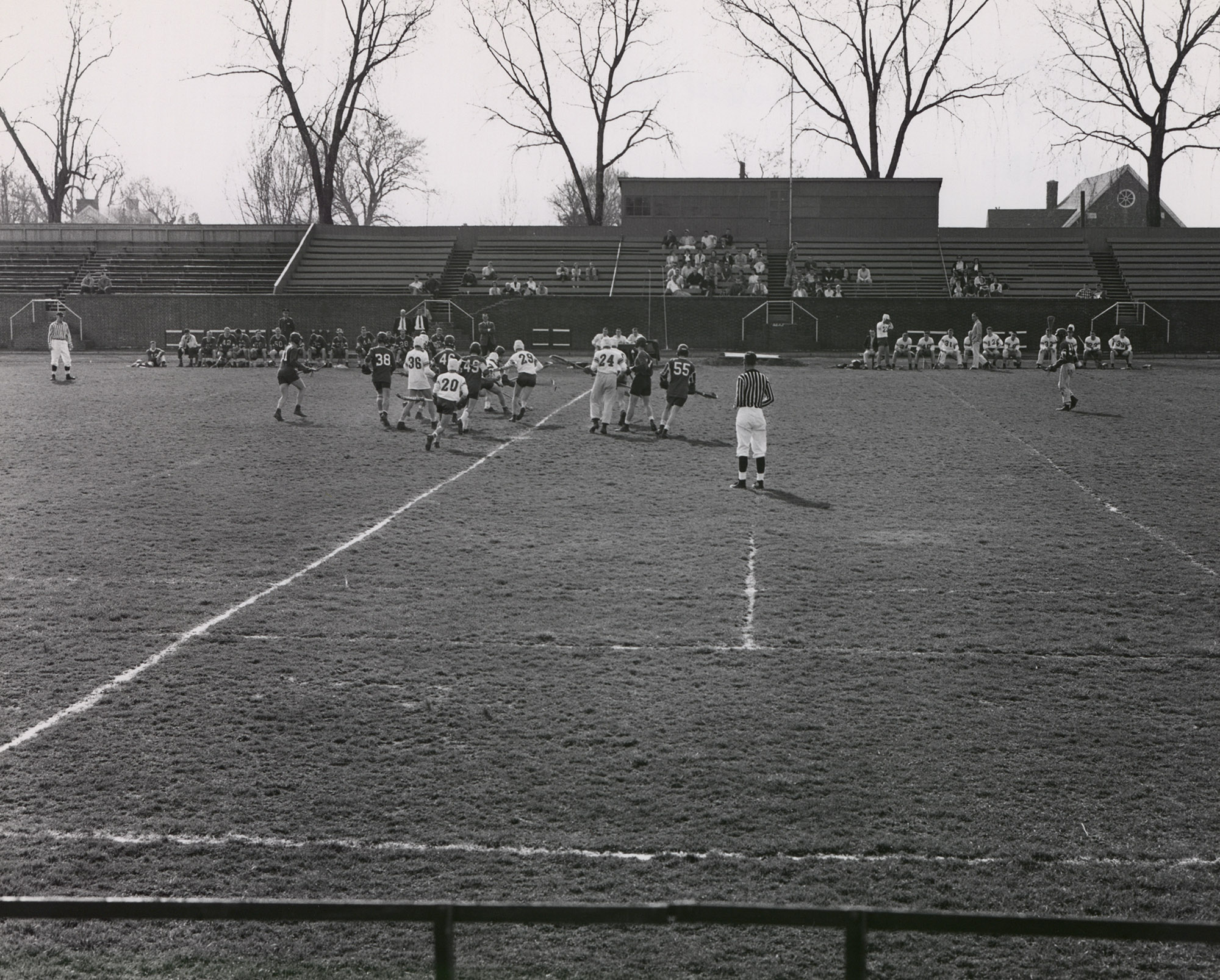 View of a Lacrosse game against Franklin & Marshall at Biddle field in April 1958.