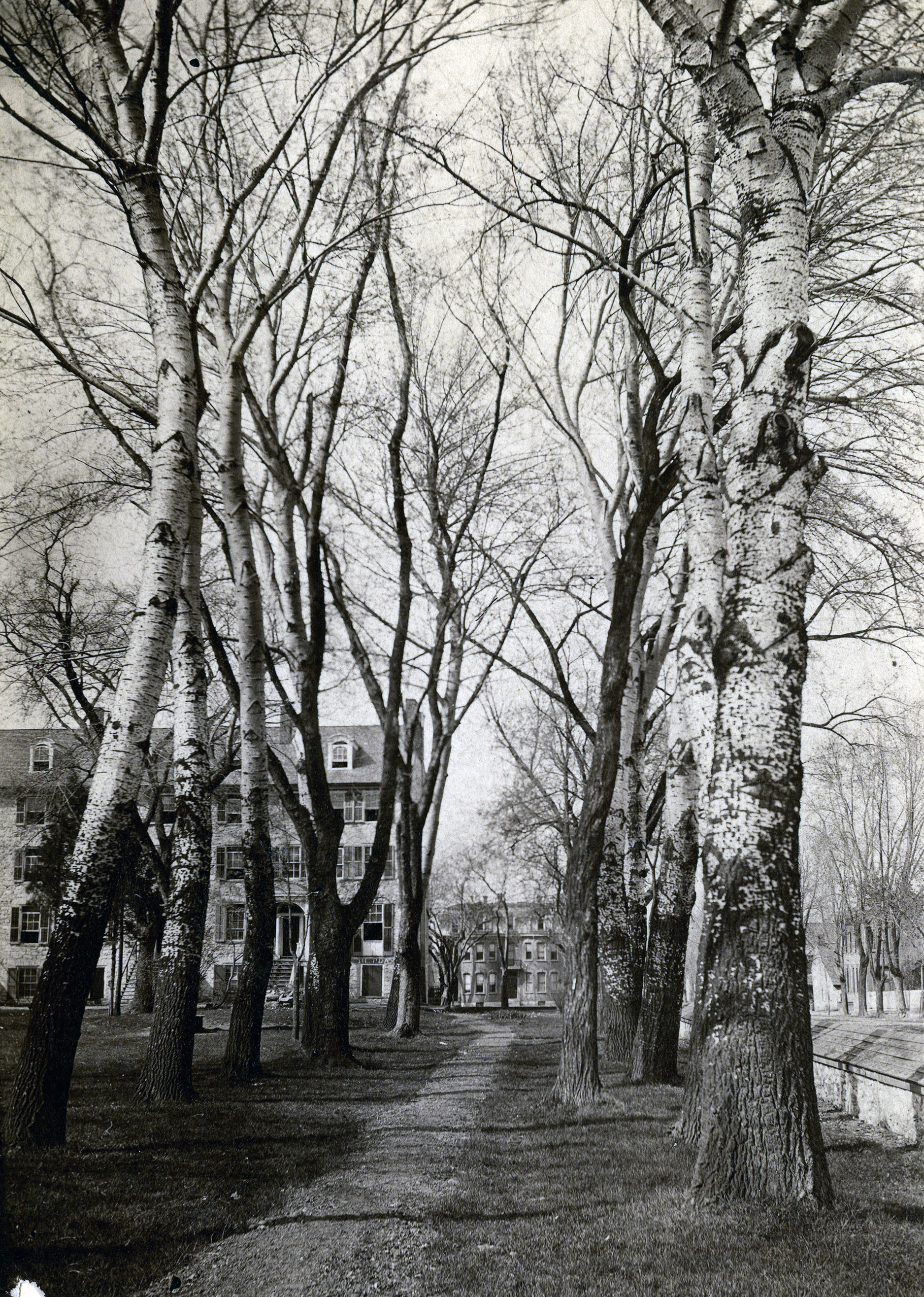 View of Lovers' Lane around 1890. East College is visible in the background. Location Photograph Archives Format Photographic Print, B&W Decade 1890-1899 Places Lovers' Lane
