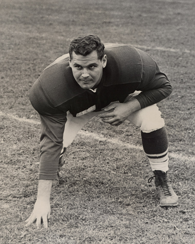 Martin Altman, a member of the Class of 1959, in his football uniform. Location Photograph Archives Format Photographic Print, B&W Decade 1950-1959 Roles Students People Altman, Martin