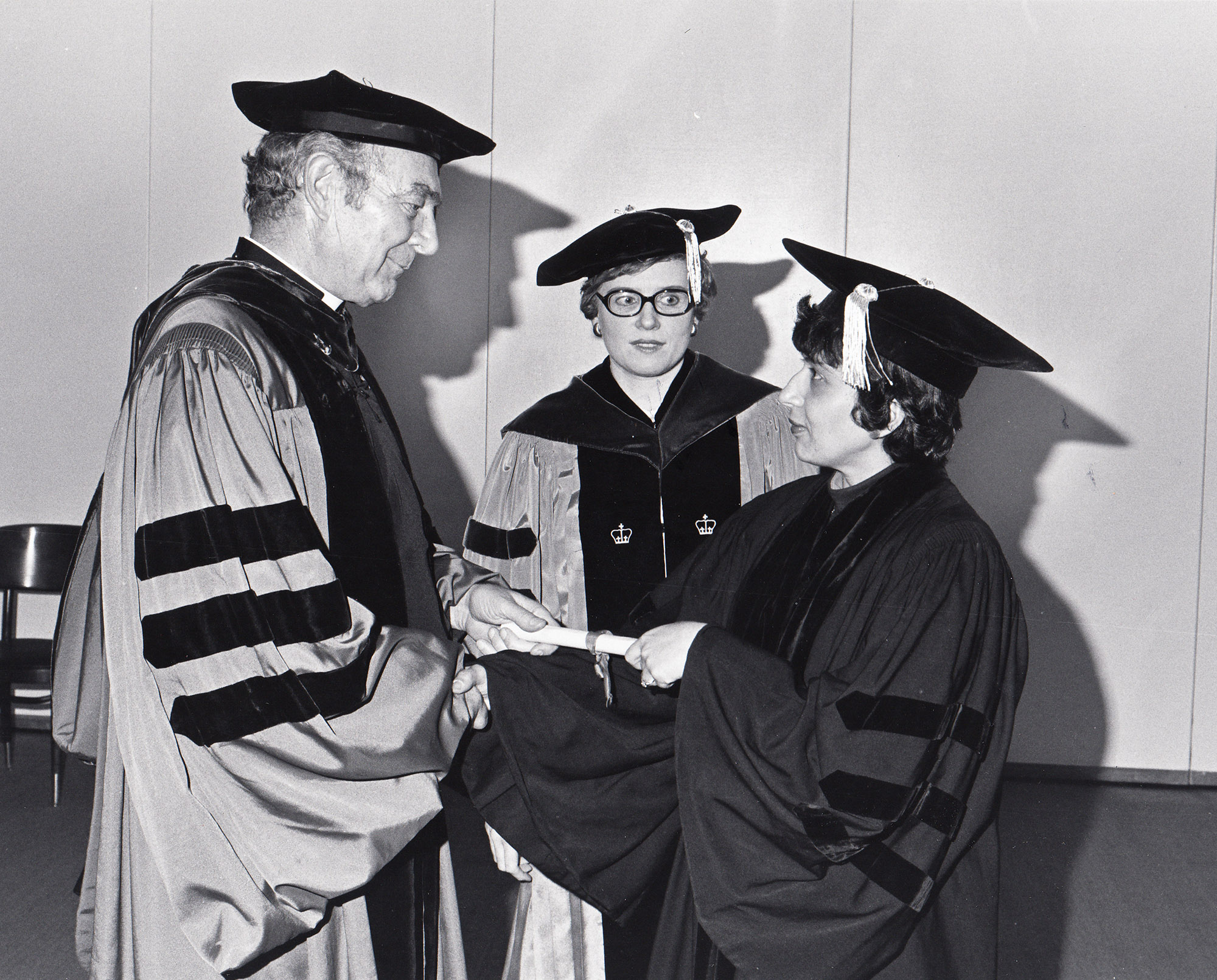 Matina Horner receives an honorary Doctor of Laws from President Howard Rubendall ('31) at Commencement on May 20, 1973. Horner's faculty sponsor, English Professor Dorothy Culp (center), looks on.