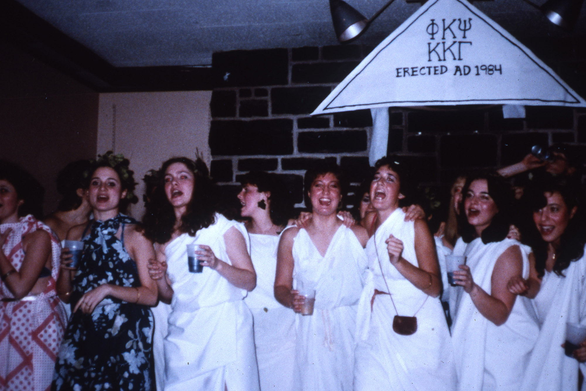 A large number of Kappa Kappa Gamma members, all dressed in togas, laugh in a group photo.
