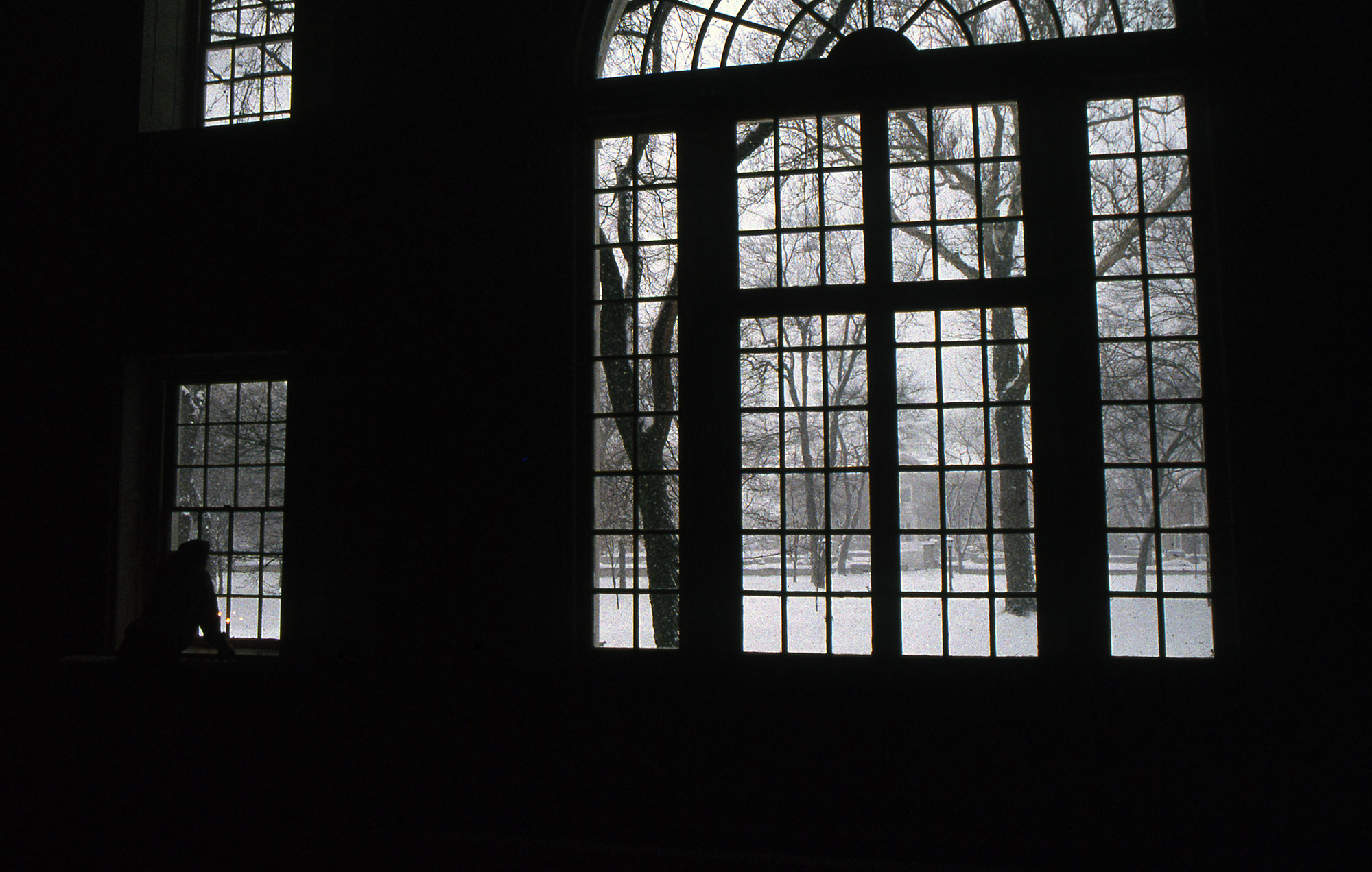 View as an individual watches snow falling outside Memorial Hall in December 1993.
