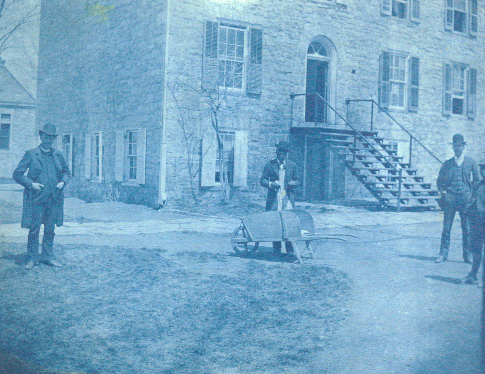 Three men, one with a wheelbarrow, stand outside the western end of East College on the John Dickinson Campus around 1890.