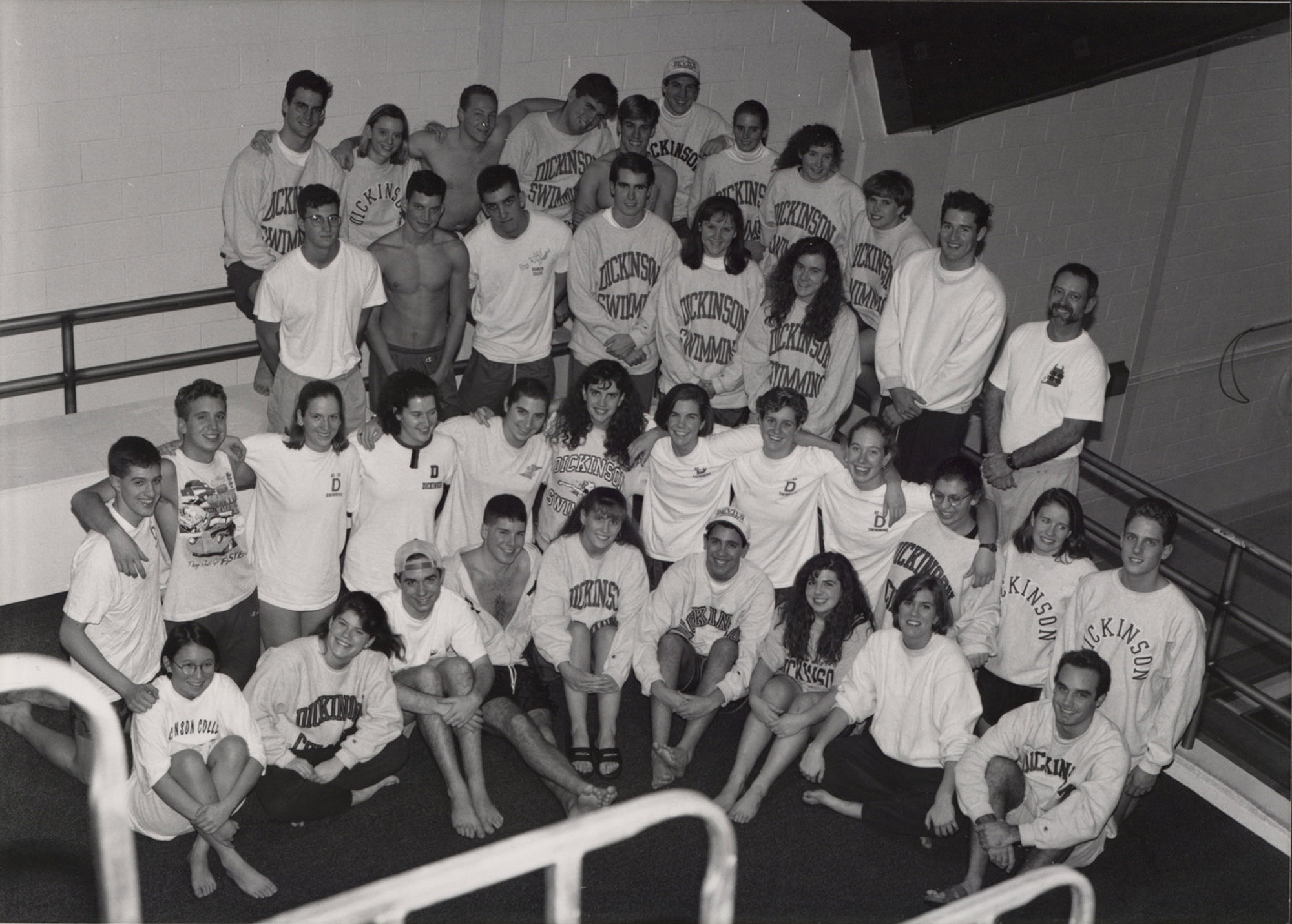 The Men's and Women's Swim teams in the Kline Center around 1985. Location Photograph Archives Format Photographic Print, B&W Decade 1980-1989 Athletics Swimming (Men's) Swimming (Women's) Roles Students