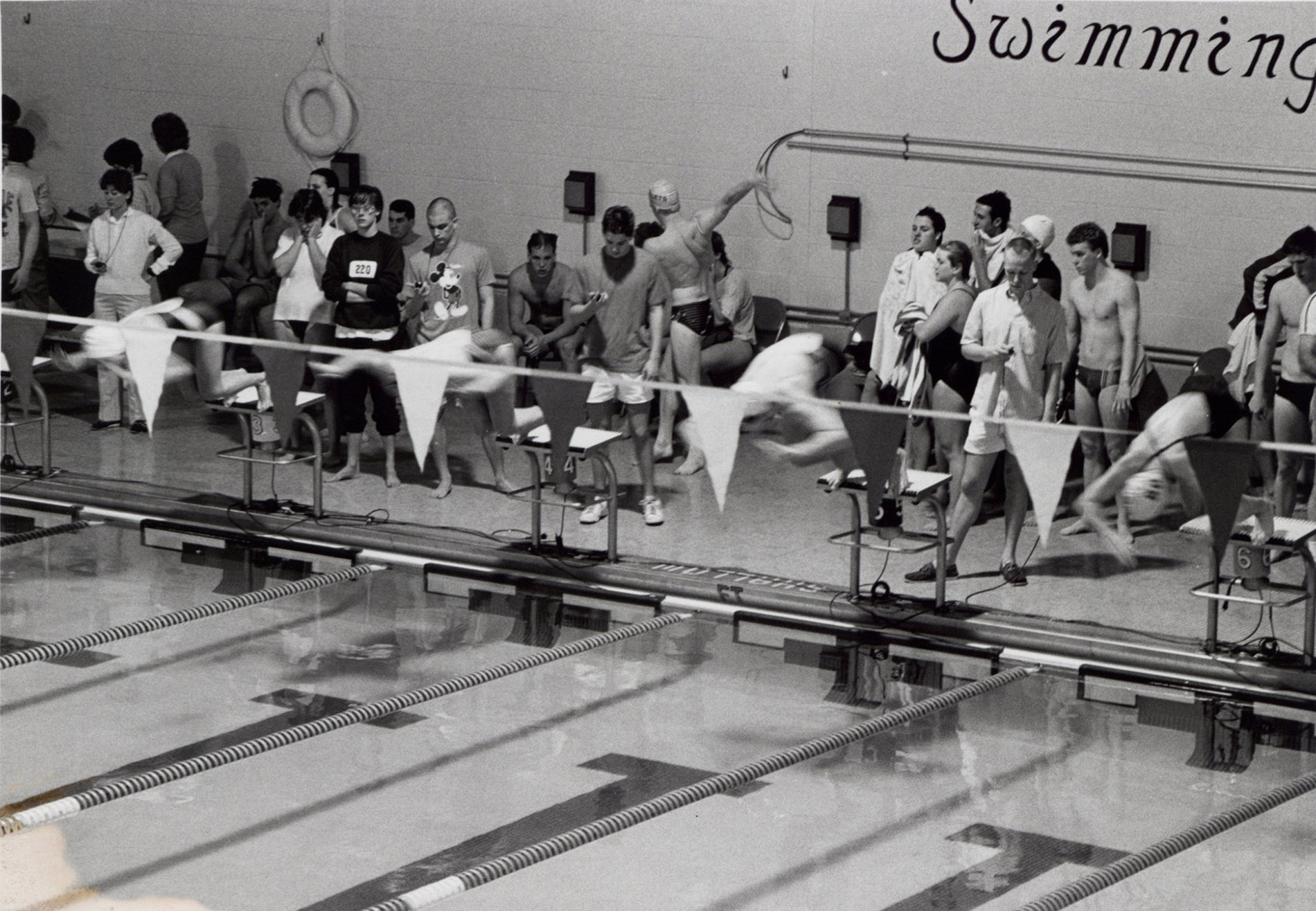 Swimmers dive into the pool during a swim meet around 1985. Location Photograph Archives Format Photographic Print, B&W Decade 1980-1989 Athletics Swimming (Men's) Swimming (Women's) Roles Students