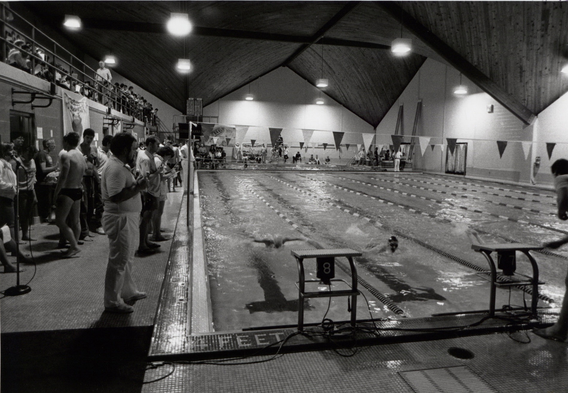 View of a swim meet in the Kline Center pool around 1985. Location Photograph Archives Format Photographic Print, B&W Decade 1980-1989 Athletics Swimming (Men's) Swimming (Women's) Roles Students