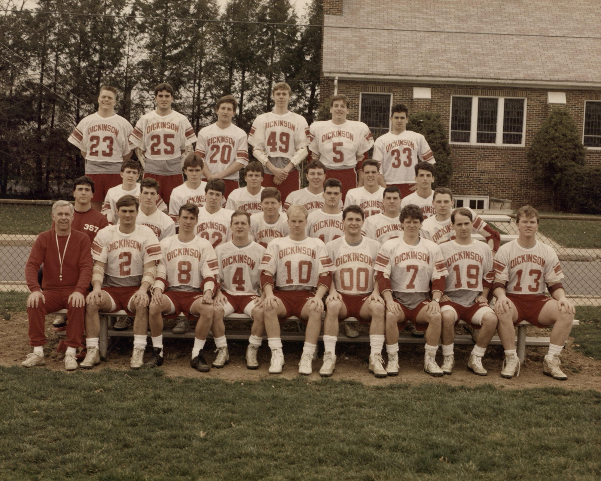 The 1988 Men's Lacrosse team with with Coaches Wilbur J. Gobrecht (first row, far left) and David Breschi (middle row, far left).