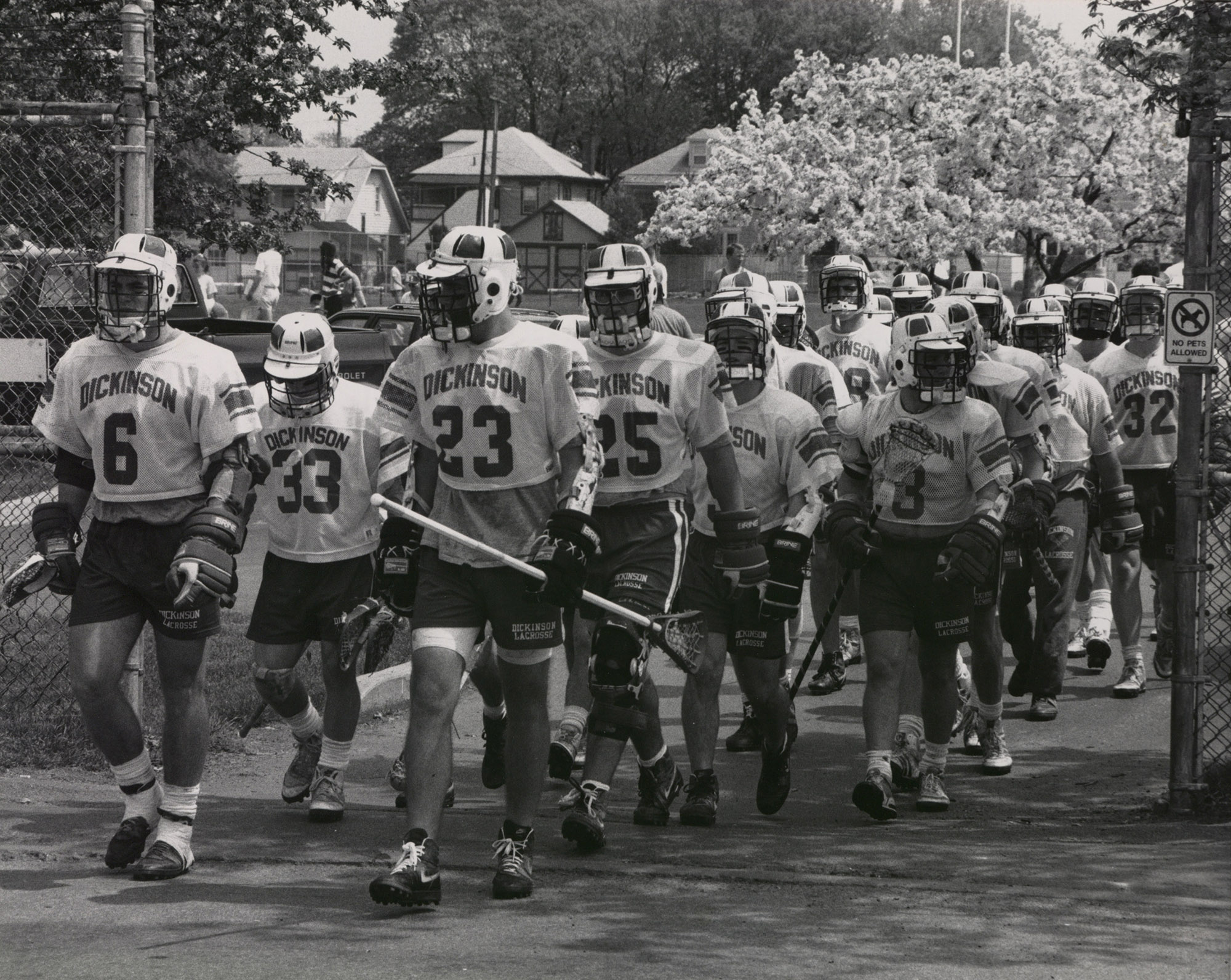 Men's Lacrosse Co-Captains Joe Glavin and Jamie Wasson lead the team to the field on game day in spring 1991.