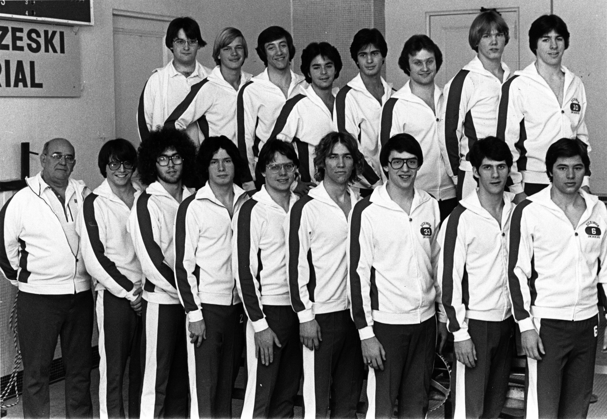 The 1978 Men's Swim team takes a group photo during the 1977-1978 season. Location Photograph Archives Format Photographic Print, B&W Decade 1970-1979 Athletics Swimming (Men's) Roles Coaches Students