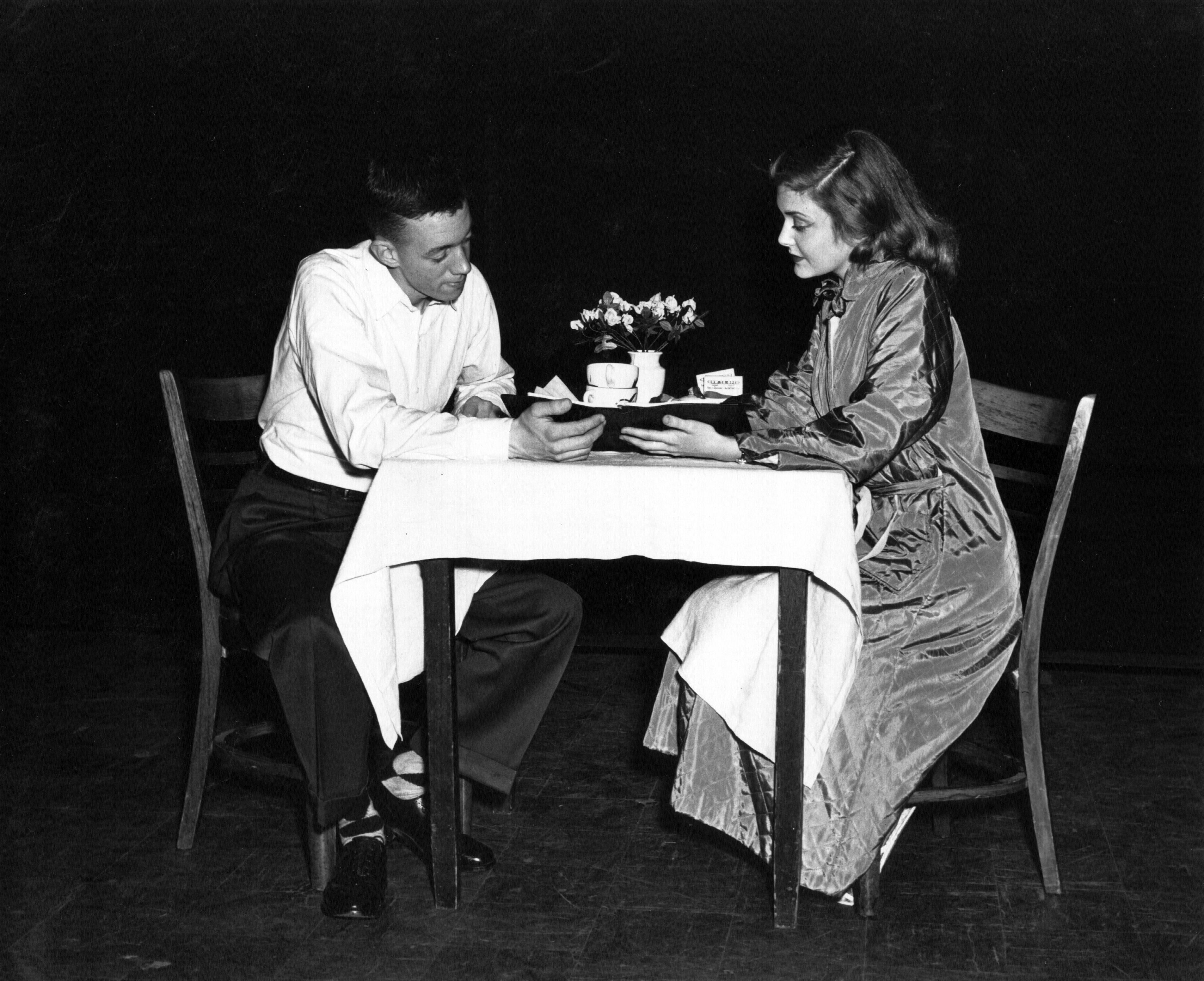 Ken Hitchner ('54) and Betty Belle McCarthy perform in the Mermaid Players' production of Beggar on Horseback in November 1952.