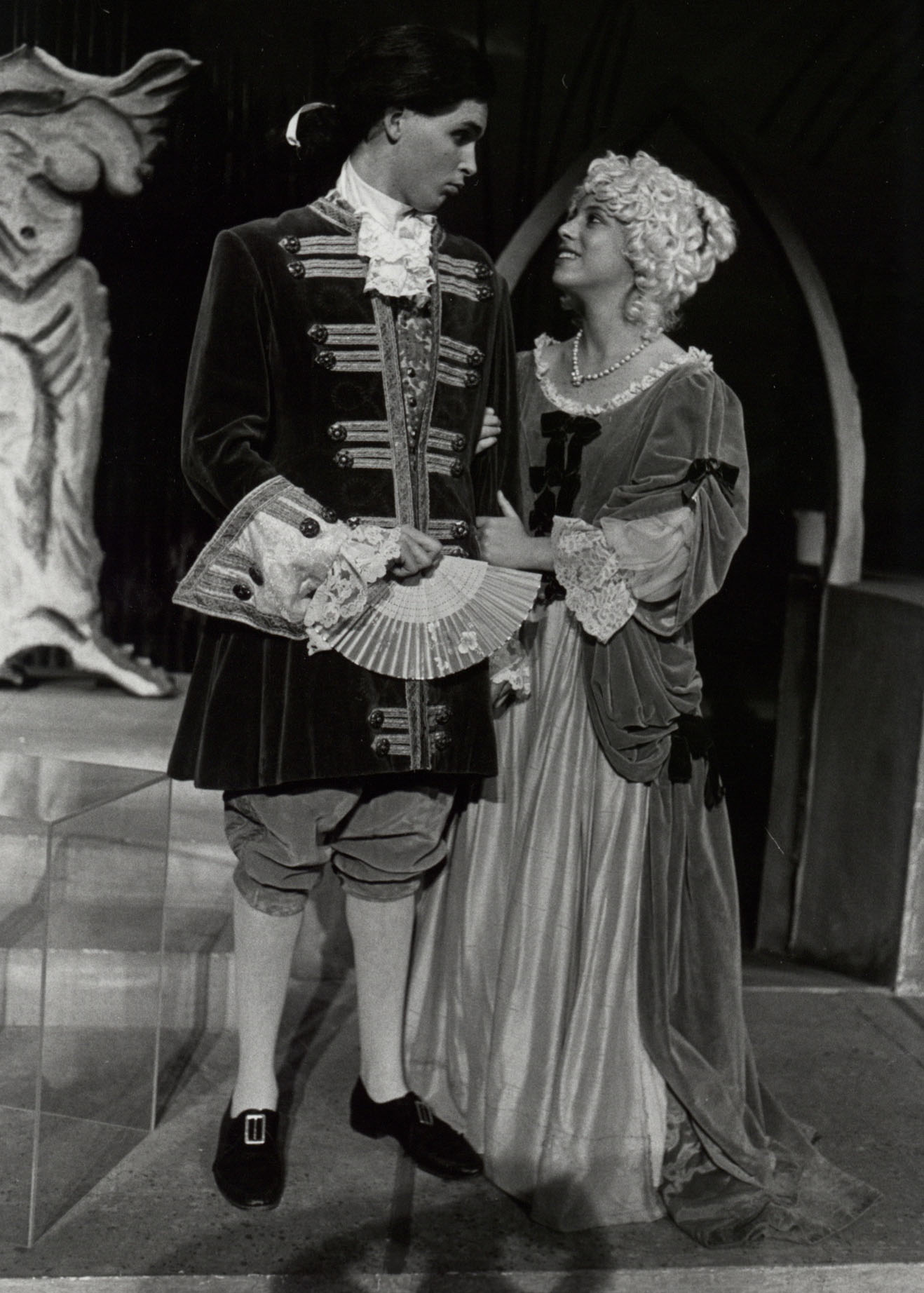 Charles Christianson ('87) and Lisa Smith ('86) perform in the Mermaid Players' production of Misanthrope in April 1986.
