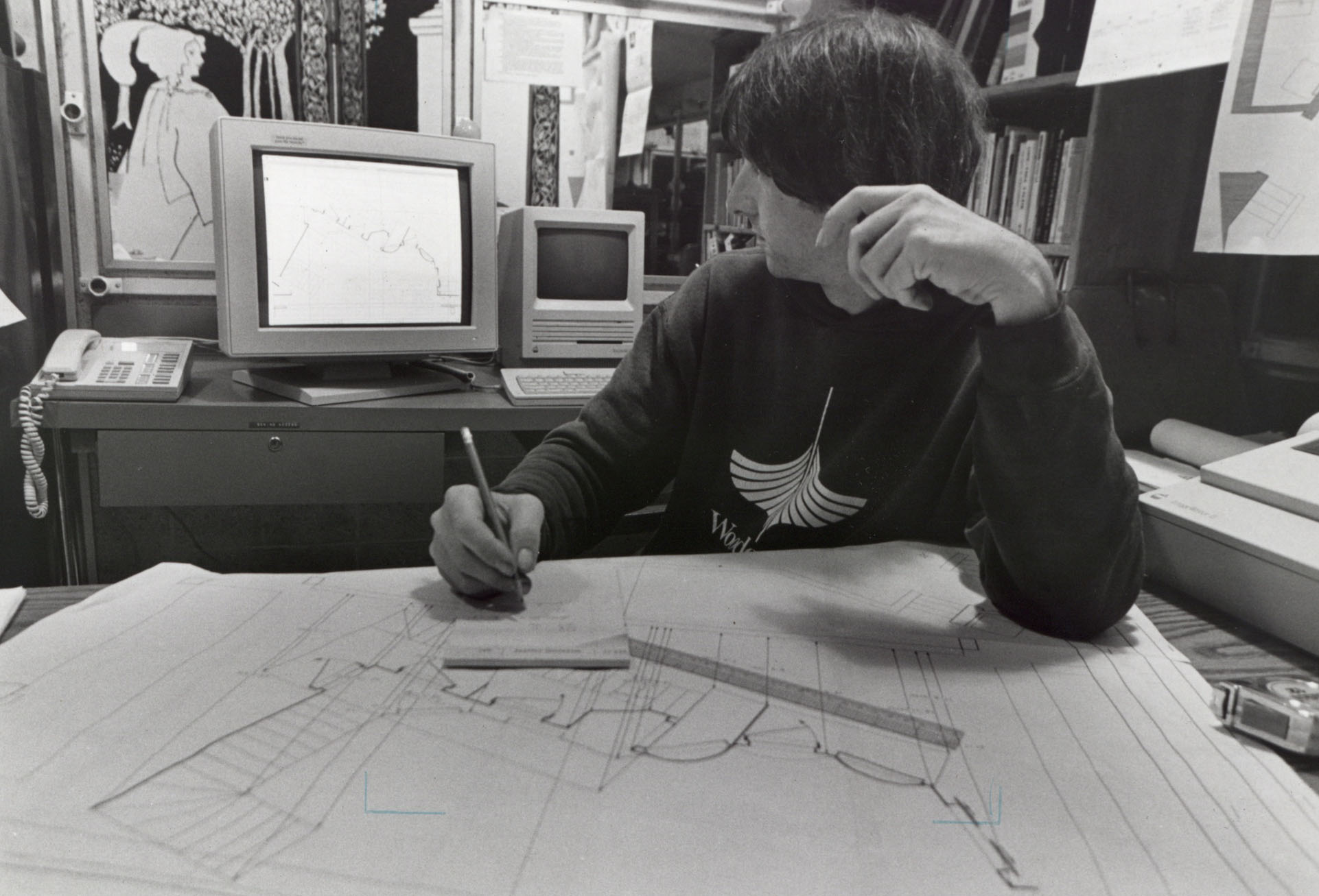 A student works on the set of the Mermaid Players' production of Noises Off in October 1988.