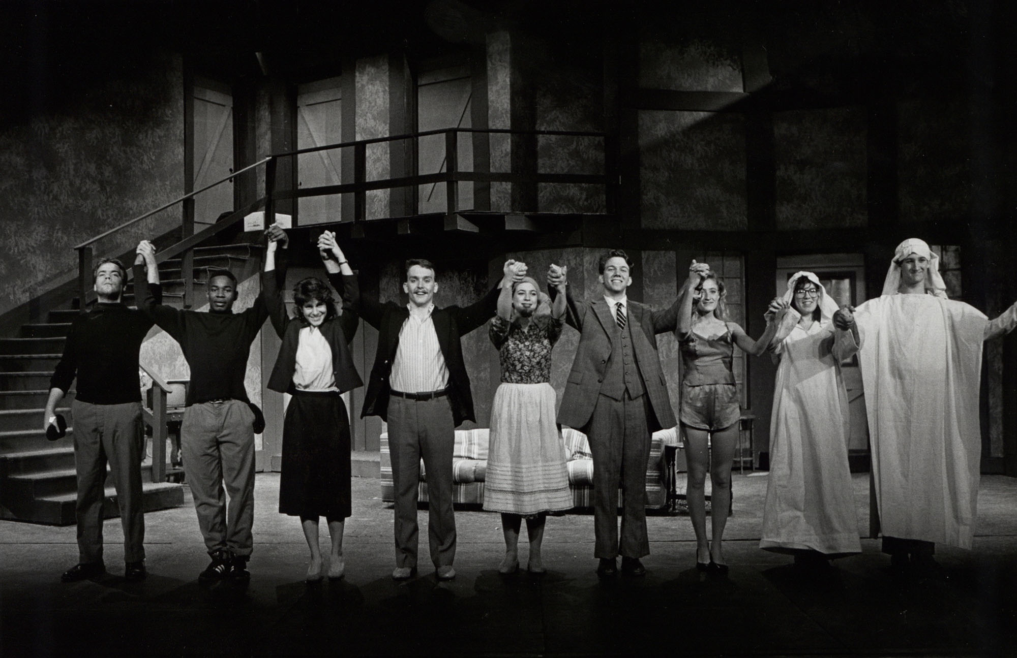 Student actors at curtain call for the Mermaid Players' production of Noises Off in October 1988.