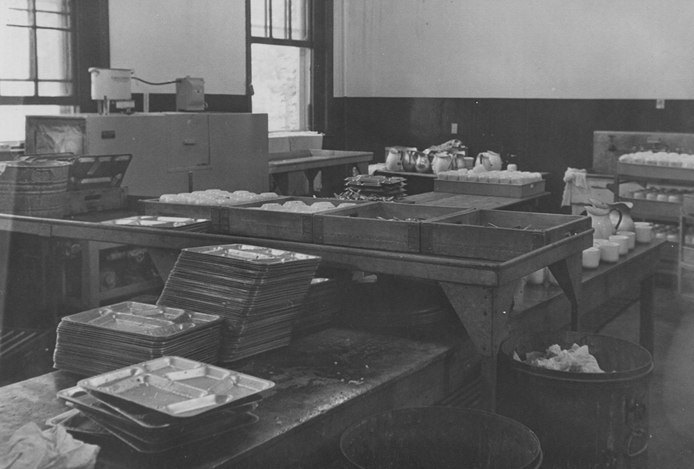 View of the dishwasher in the Mess Hall kitchen in 1944. The 32nd College Training Detachment use this facility during World War II.