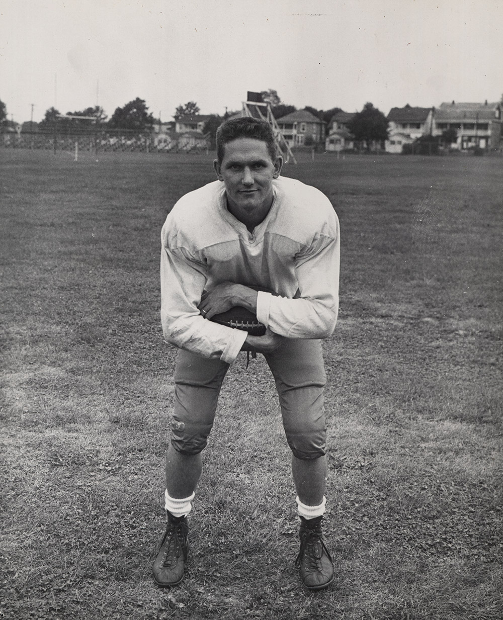 Millard Filmore Mecklem, a member of the Class of 1949, in his football uniform.