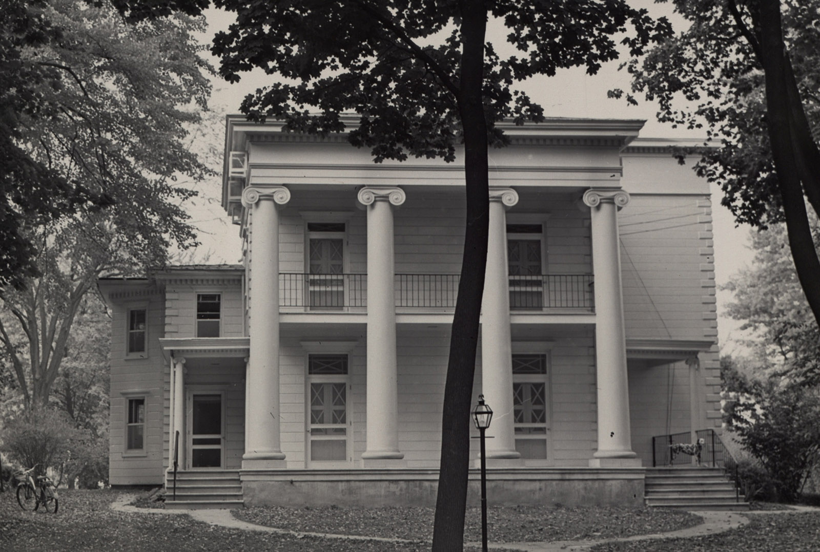 A dog stands on the front stairs on the right side of Montgomery Hall around 1950. Location Photograph Archives Format Photographic Print, B&W Decade 1950-1959 Places Montgomery Hall