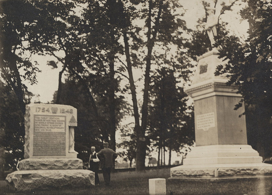 View as two men stand next to a monument at Gettysburg Battlefield around 1920. One of the men might be Charles Gilbert Beetem, a member of the Class of 1904.