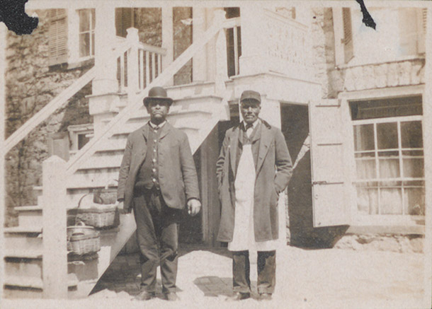 Noah Pinkney (right) stands next to another man outside an entrance to East College around 1910. Location Photograph Archives Format Photographic Print, B&W Decade 1910-1919 Places East College People Pinkney, Noah