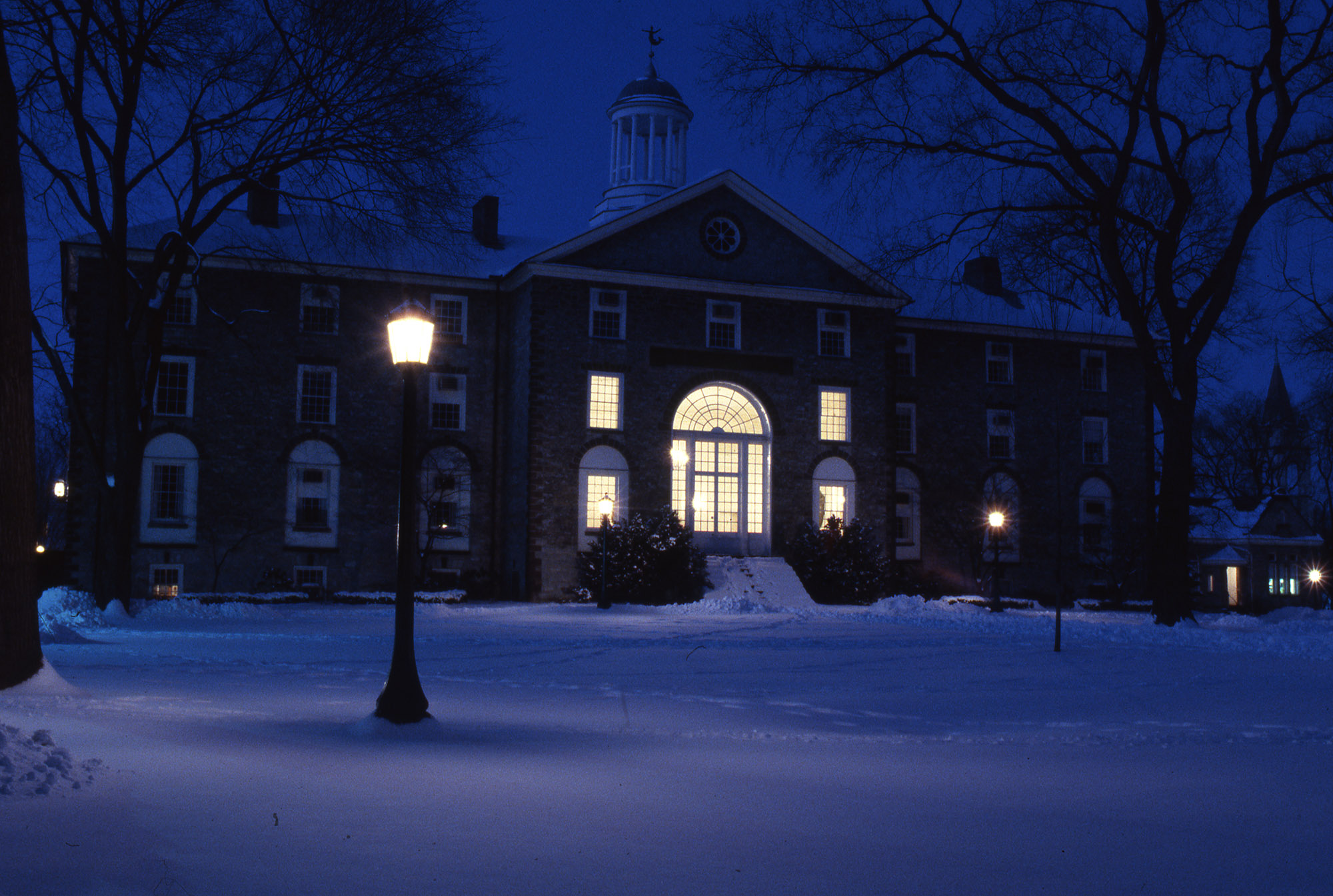 View of Old West at night after a snowstorm in spring 1989. Location Slide Archives Format Slide (35mm) Decade 1980-1989 Places West College (Old West) Other Campus at Night Campus Winter Scenes