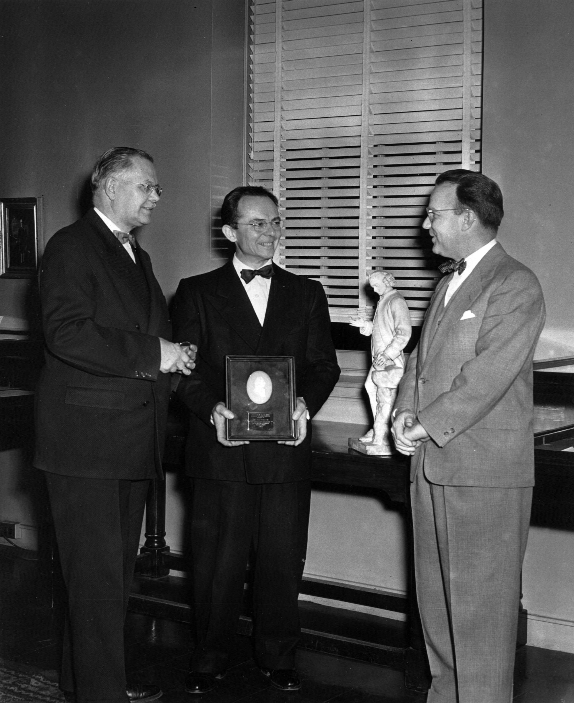 Dr. Paul Rufus Burkholder '24 (center) receives the Priestley Award on March 10, 1953.