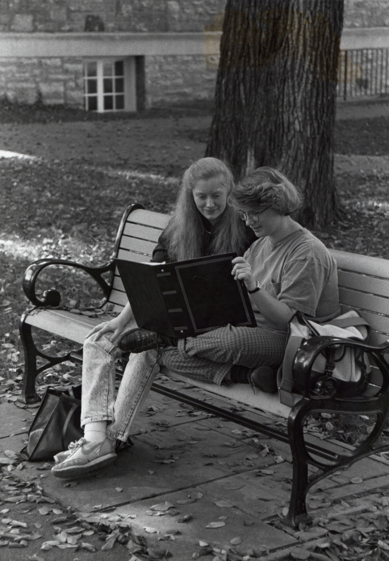 Two students sit on a bench in the academic quad and look through a photo album during Homecoming weekend in November 1990.