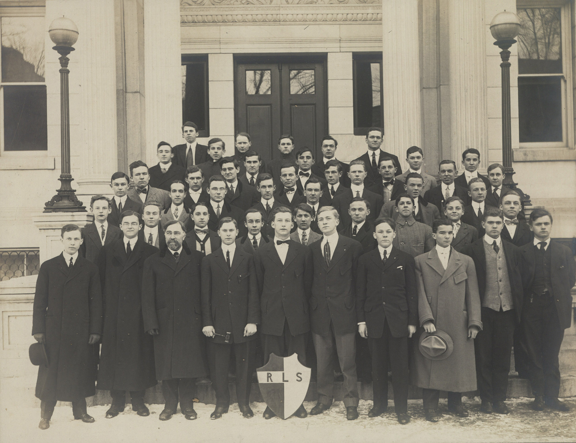 Members of the Reed Literary Society of Dickinson Preparatory School stand outside Bosler Memorial Library during the 1909-1910 academic year.