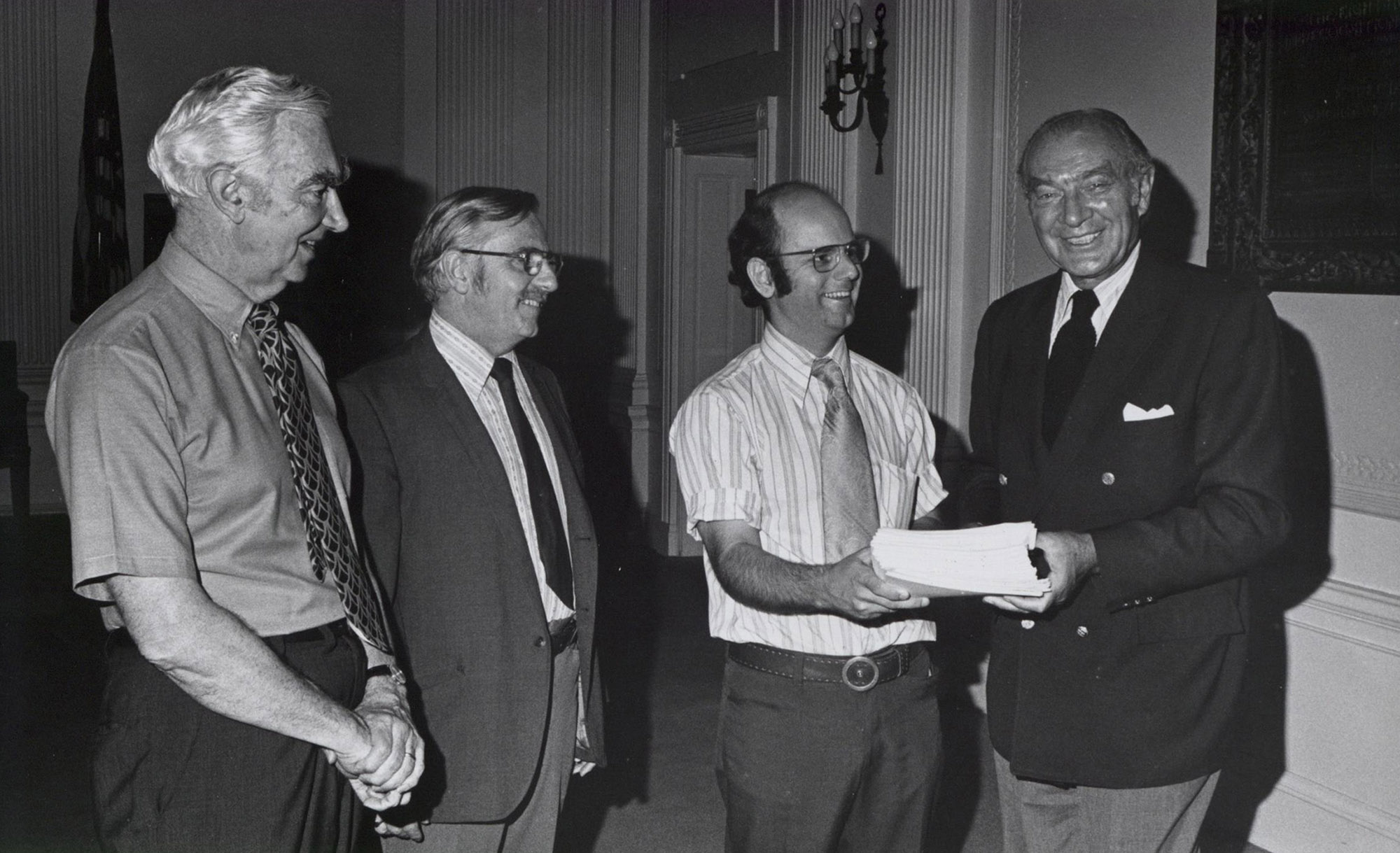 President Rubendall talks with several faculty members at the Curriculum Report meeting in 1973.