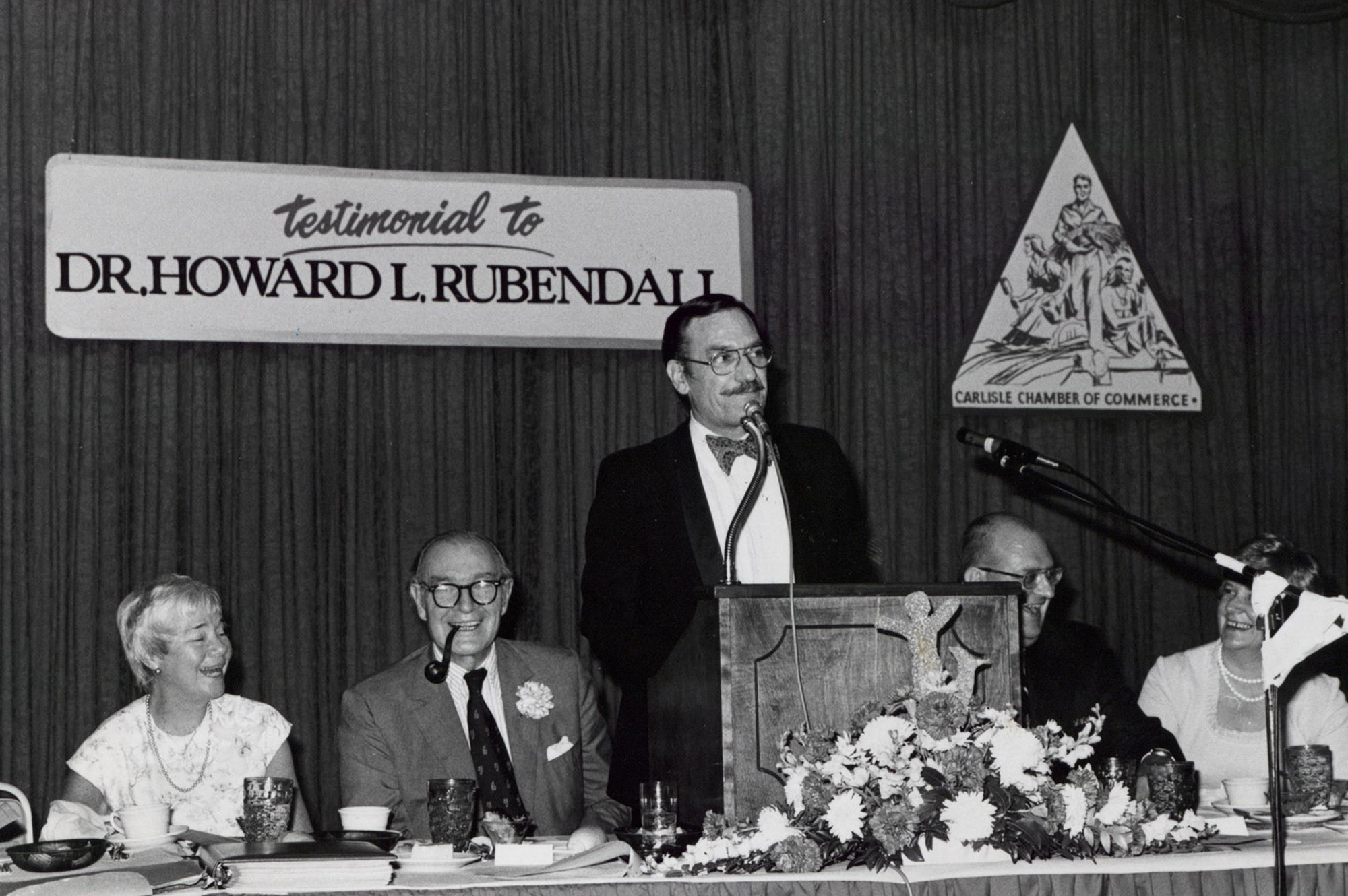 President Rubendall is laughing with his wife, Carolyn, during a "Testimonial to Dr. Howard L. Rubendall" event. Location Photograph Archives Format Photographic Print, B&W Decade 1970-1979 Roles Alumni Presidents People Rubendall, Howard Lane Dennett Rubendall, Carolyn