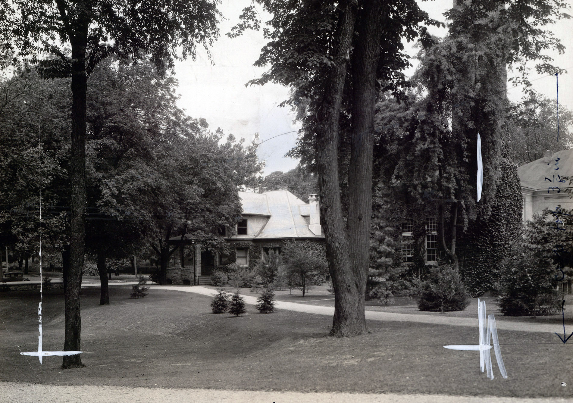 View of the Psychology Building from the Academic Quad around 1955. The Heating plant and part of the Old Gymnasium are visible on the left side.