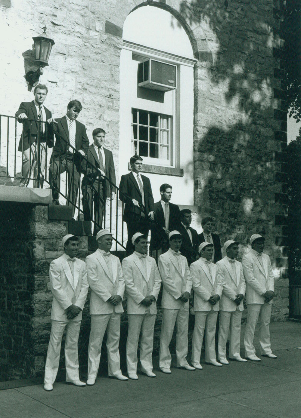 Members of Raven's Claw outside Old West in 1990. Location Photograph Archives Format Photographic Print, B&W Decade 1990-1999 Groups and Organizations Raven's Claw Roles Students