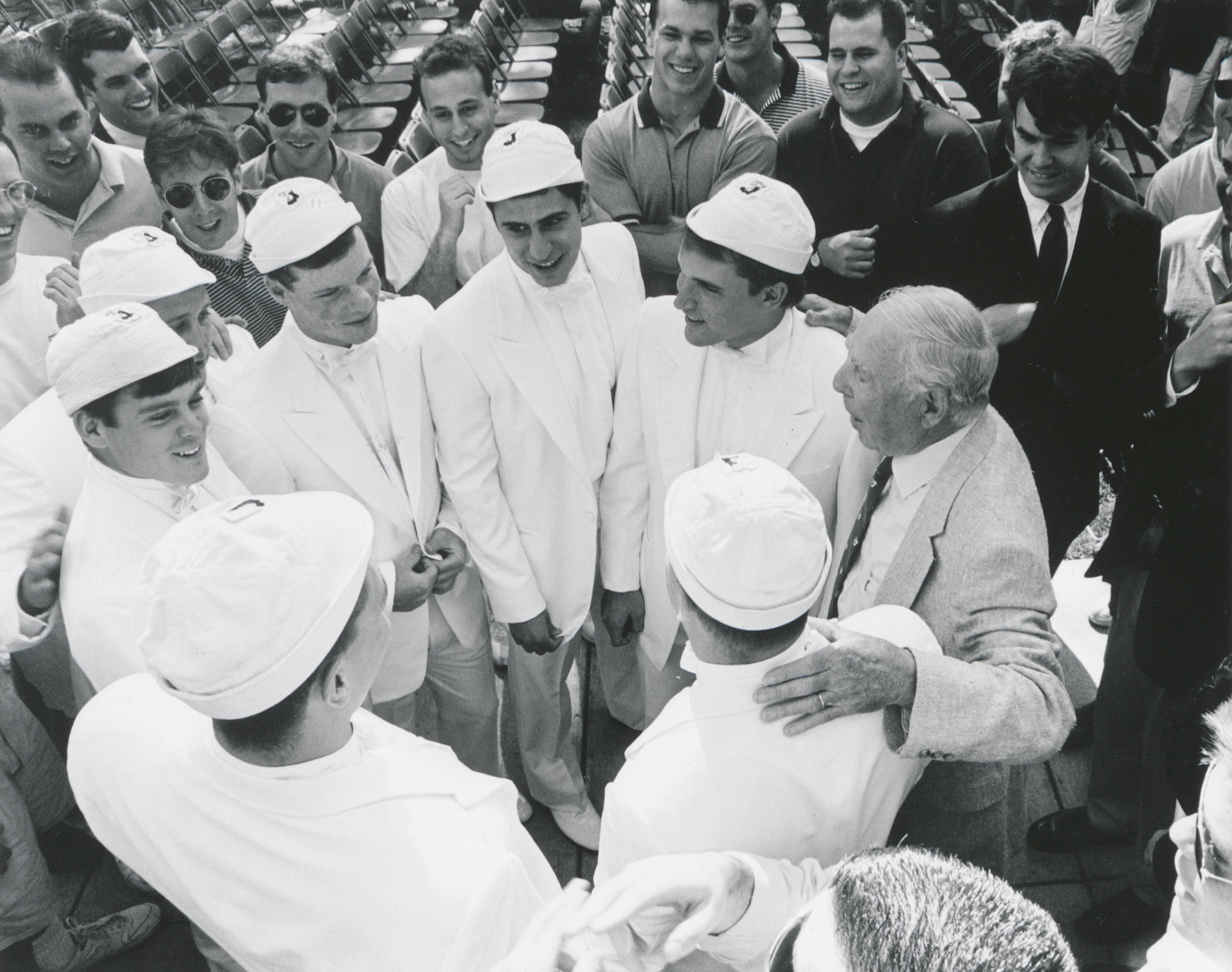 Professor Emeritus Ben James ('34) leads the Raven's Claw "Caw, caw, caw" cheer in May 1994.