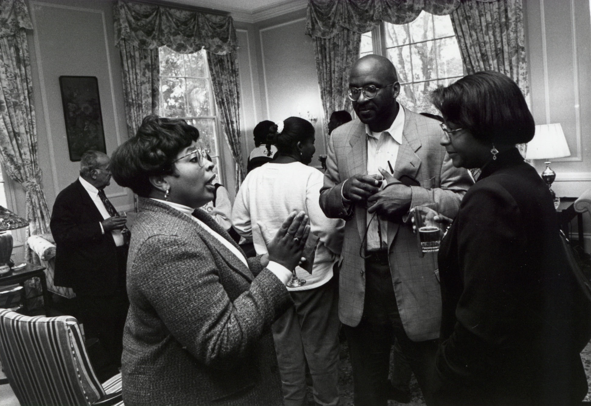 Frank James III '79 and his wife Vickie Walton-James discuss issues with Dickinson Director of News Services Adrian M. Bailey during a reception for African American alumni hosted by President A. Lee Fritschler during Homecoming weekend in fall 1996.