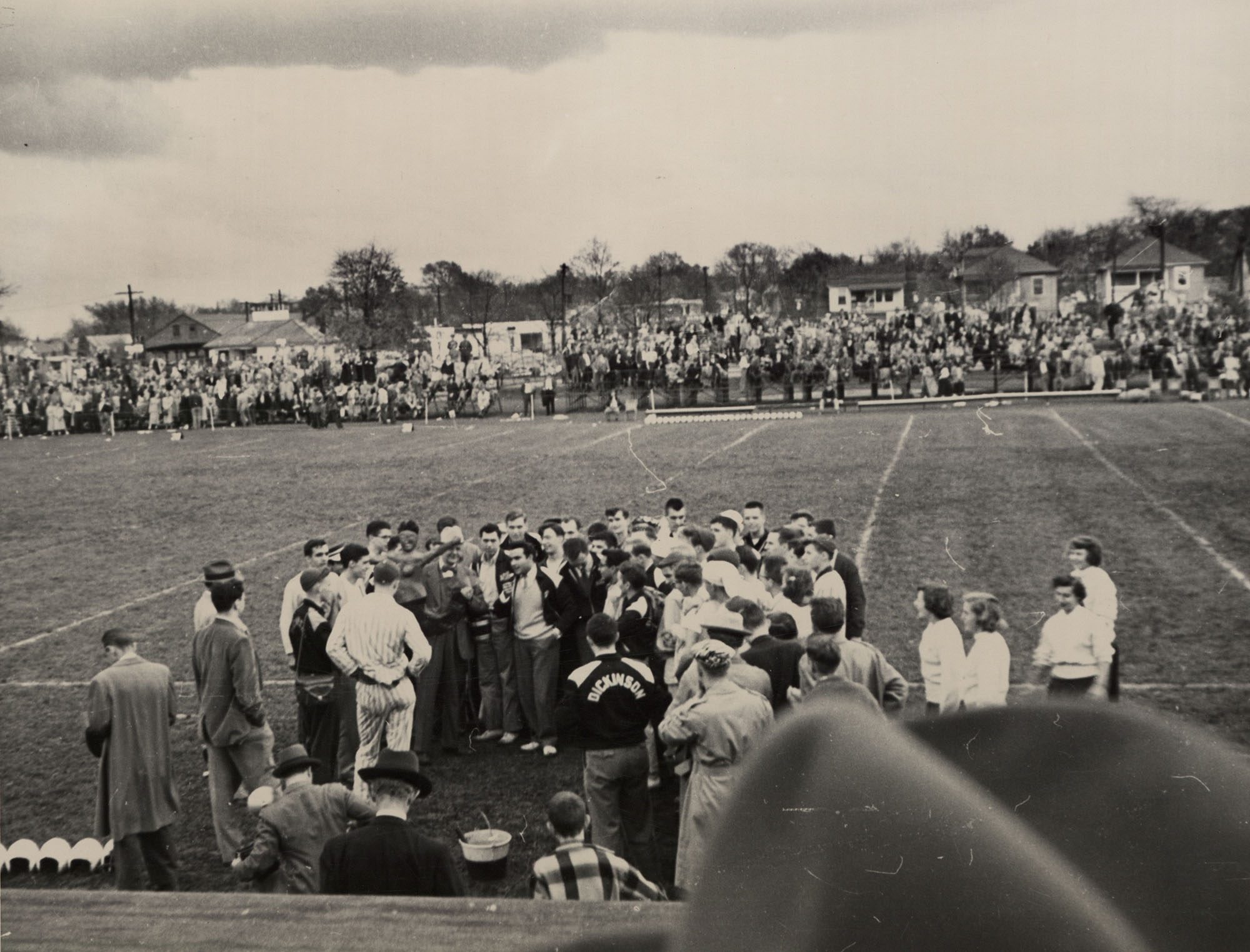 Students return the mermaid to President William Edel during the Homecoming football game in fall 1950.