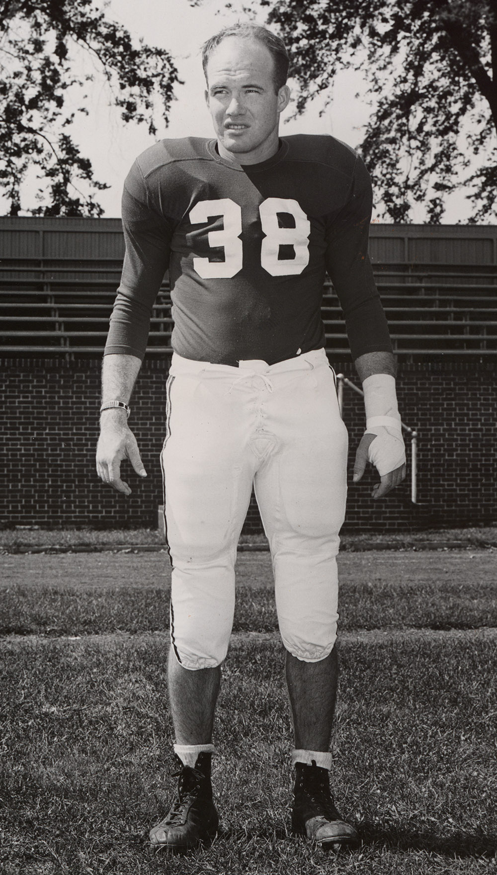 Robert Ellsworth Faunce, a member of the Class of 1959, in his football uniform. Location Photograph Archives Format Photographic Print, B&W Decade 1950-1959 Roles Students People Faunce, Robert Ellsworth
