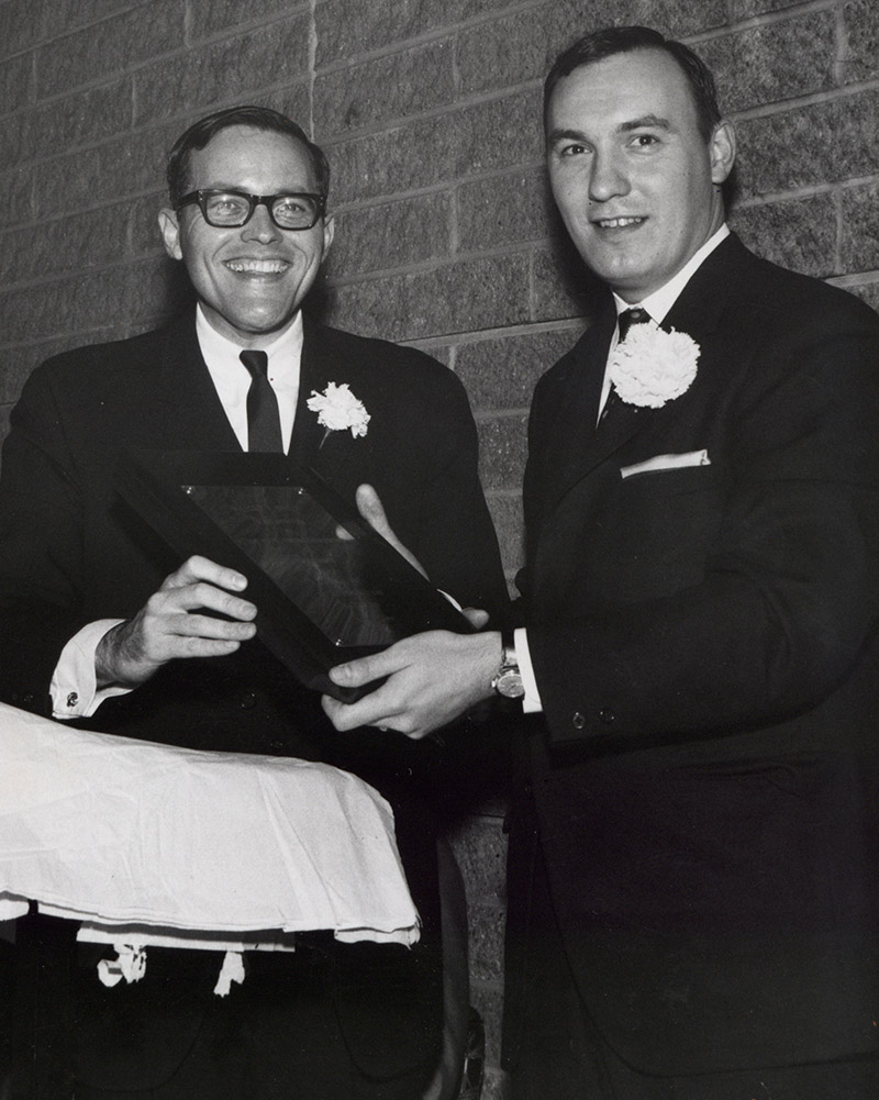 View of Robert Elmo Young and William T. Smith, both members of the Class of 1959, at an event. Location Photograph Archives Format Photographic Print, B&W Decade 1950-1959 Roles Students People Young, Robert Elmo Smith, William Trickett
