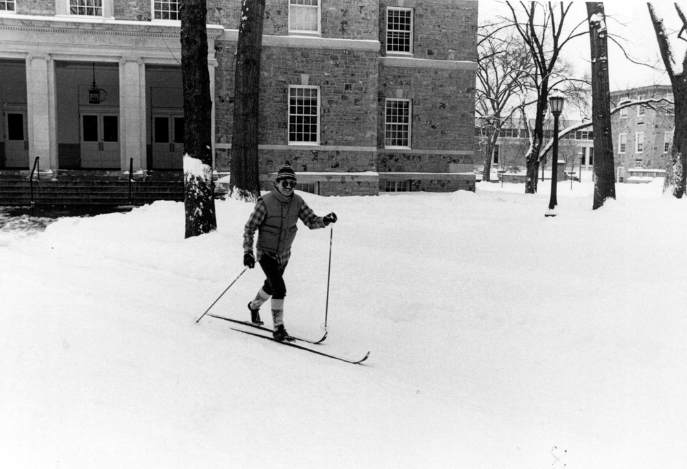 Professor of Physics Robert Doyle enjoys skiing across campus after a snowfall in February 1986.