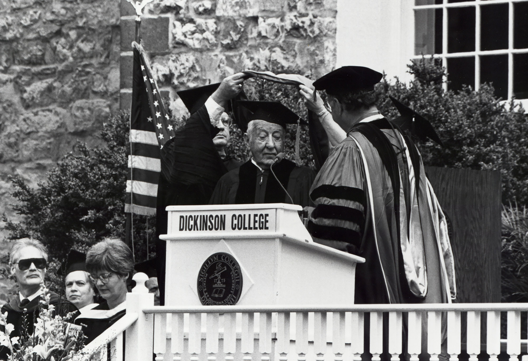 Robert A. Waidner receives an Honorary Doctor of Finance at Commencement on May 21, 1995. President Fritschler is speaking at the podium.