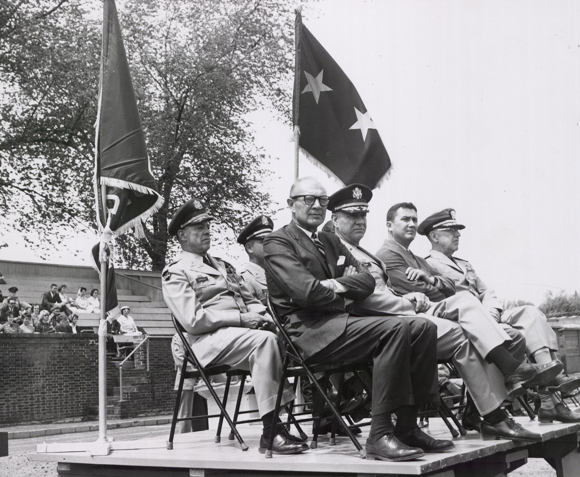 President Howard L. Rubendall sits on a platform with several military officers on ROTC Awards day around 1965.