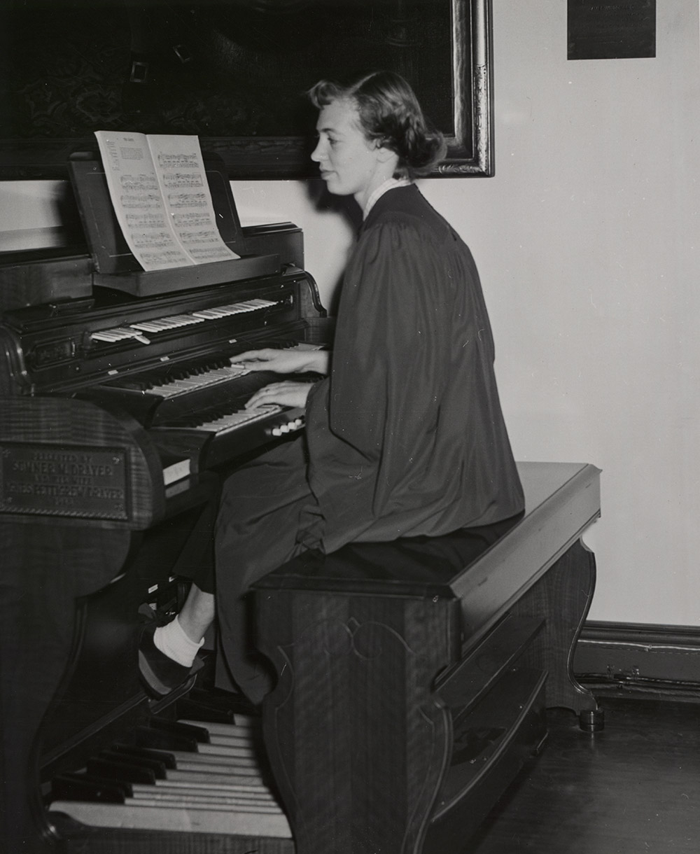 View as Ruth Eileen Baumeister (Class of 1954) plays the piano in 1954. Location Photograph Archives Format Photographic Print, B&W Decade 1950-1959 Roles Students People Baumeister, Ruth Eileen